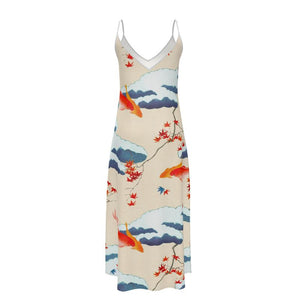 Experience the beauty of Koi and Autumn Leaves with our Silk Slip Dress, featuring a stunning print inspired by vintage Japanese art. Its adjustable straps ensure a perfect fit while the ankle-length design exudes elegance. Available in sizes XXS-7XL, this dress is perfect for any occasion. Let the cream background add a touch of sophistication to your wardrobe. Indulge in this exquisite piece and elevate your style.A stunning testament to traditional Japanese art, the dress exudes a calming aura with its captivating koi and autumn leaves design set against a cream background.