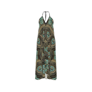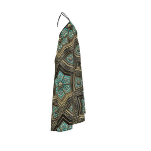 Rückenloses Boho Maxi Seidenhalterkleid, Jugendstilkleid