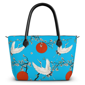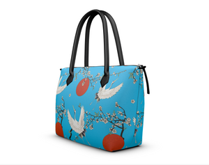 Ce sac à main zippé merveilleusement lumineux et frais est un excellent ajout à n'importe quelle garde-robe et complète n'importe quelle tenue. Avec un motif de grues asiatiques et de fleurs de cerisier et un fond bleu doux, ce sac à main est un sujet de discussion tout en étant fabriqué à partir de cuir nappa souple.